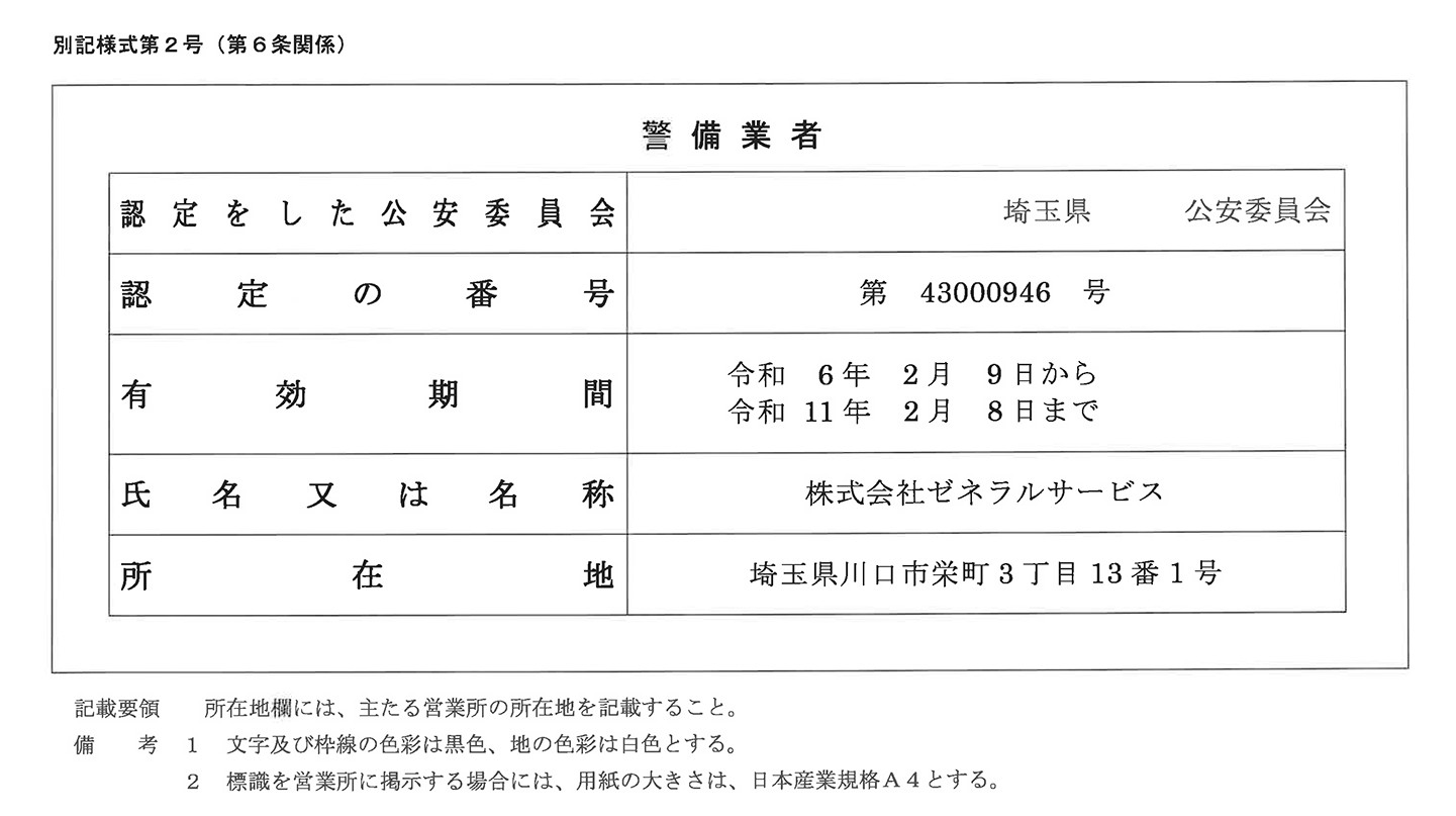 | 登録 | 建築物清掃業登録 登録番号 川口市430清第2号 登録番号 北海道9清第17号 建築物ねずみ昆虫等防除業登録 登録番号 川口市504ね第1号 警備業認定証(埼玉県公安委員会)第43000946号 宅地建物取引業者票 国土交通大臣・埼玉県知事(1)第24810号 |